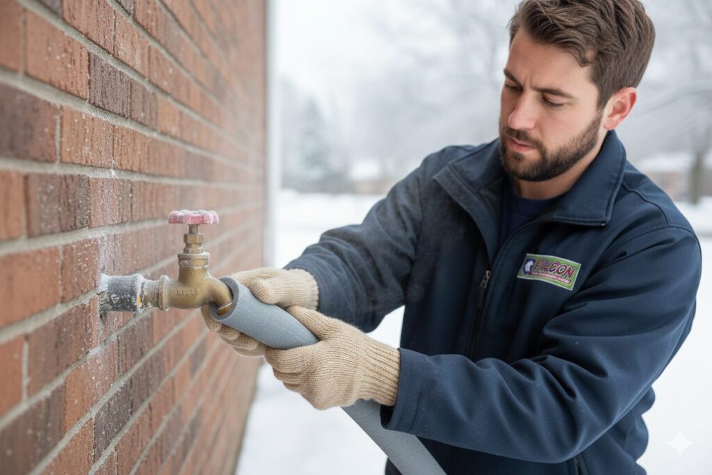 One of the first indicators of a winter plumbing problem is slow drains or reduced water pressure. Cold temperatures can cause grease, soap residue, and debris inside pipes to harden, narrowing the passage for water. In some cases, partial freezing may already be restricting flow. Falcon technicians often identify these issues during winter inspections and clear them before they develop into full blockages or burst pipes.